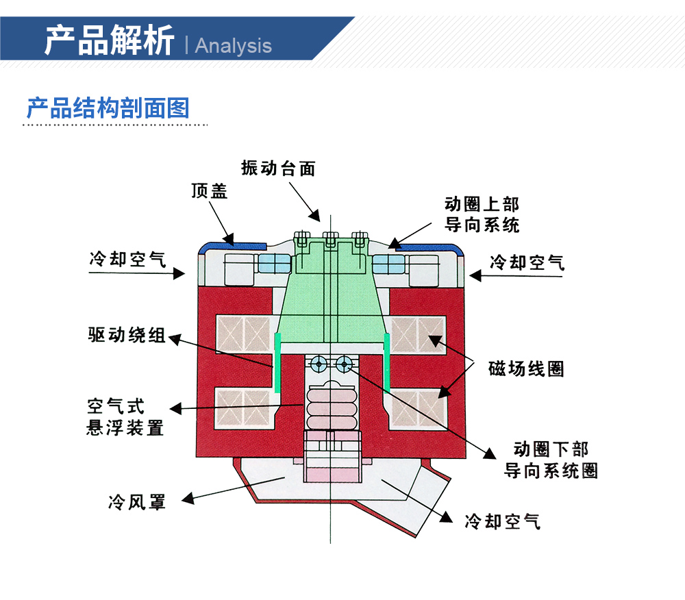 性能特點:●強制風冷 ●正弦激振力范圍: 1kN ~ 70kN●兩倍的正弦沖擊力(2噸以上可選三倍) ●輕質(zhì)動圈,優(yōu)化設(shè)計,耐振性能強●中心氣囊承載能力強,低頻性能好 ●可配置水平滑臺●風機冷卻效果好,噪音低 ●使用頻率可從1Hz開始●隨機與正弦激振力1:1 ●位移峰峰值最大可達100mm●耳軸氣囊隔震效果好 ●雙磁路設(shè)計,漏磁低,磁場均勻●正弦、隨機、沖擊等試驗功能 ●高效率、高可靠性功率放大器系統(tǒng)特點:◎一階共振頻率高、使用頻率寬優(yōu)化的動圈骨架結(jié)構(gòu)設(shè)計,特別是對傳統(tǒng)結(jié)構(gòu)的動圈骨架傳力角板等薄弱環(huán)節(jié)進行增強設(shè)計,有效提高了傳力剛度;采用膠接與螺釘連接的復合固定繞線環(huán)筒和繞線環(huán)筒增強膠孔的新結(jié)構(gòu),增強了繞組的剛度。顯著提高了動圈的一階共振動頻率,超過了國際同類產(chǎn)品。◎動圈繞組可靠性高獨創(chuàng)的動圈繞組加強環(huán)的新結(jié)構(gòu)和新工藝,顯著提高了動圈繞組工作在大推力、高加速度振動、沖擊和高溫環(huán)境中的耐振可靠性。◎風冷效率高創(chuàng)新的電動臺冷卻風道設(shè)計:改進了進風結(jié)構(gòu),上磁環(huán)用長槽型進風道取代圓孔型進風道;勵磁線圈采用蜂窩式風道、中磁環(huán)采用雙層風流式風道、下磁環(huán)采用斜楔型風道等新結(jié)構(gòu),顯著提高了冷卻效果。◎冷卻風機冷卻風機具有獨特的風道等結(jié)構(gòu)設(shè)計,風機冷卻效果好,噪音低。◎水平和垂直試驗帶水平滑臺的電動振動臺可以用于水平和垂直試驗,兩個方向的切換方式簡單,翻轉(zhuǎn)方便。◎采用IGBT模塊功放采用性能可靠的MOSFET和IGBT模塊,具有很高的穩(wěn)定性和可靠性。◎安全性能產(chǎn)品符合歐洲標準測試要求,在功放上裝有緊急停止開關(guān),有效應對突發(fā)事件。符合美國UL和CE安全要求。